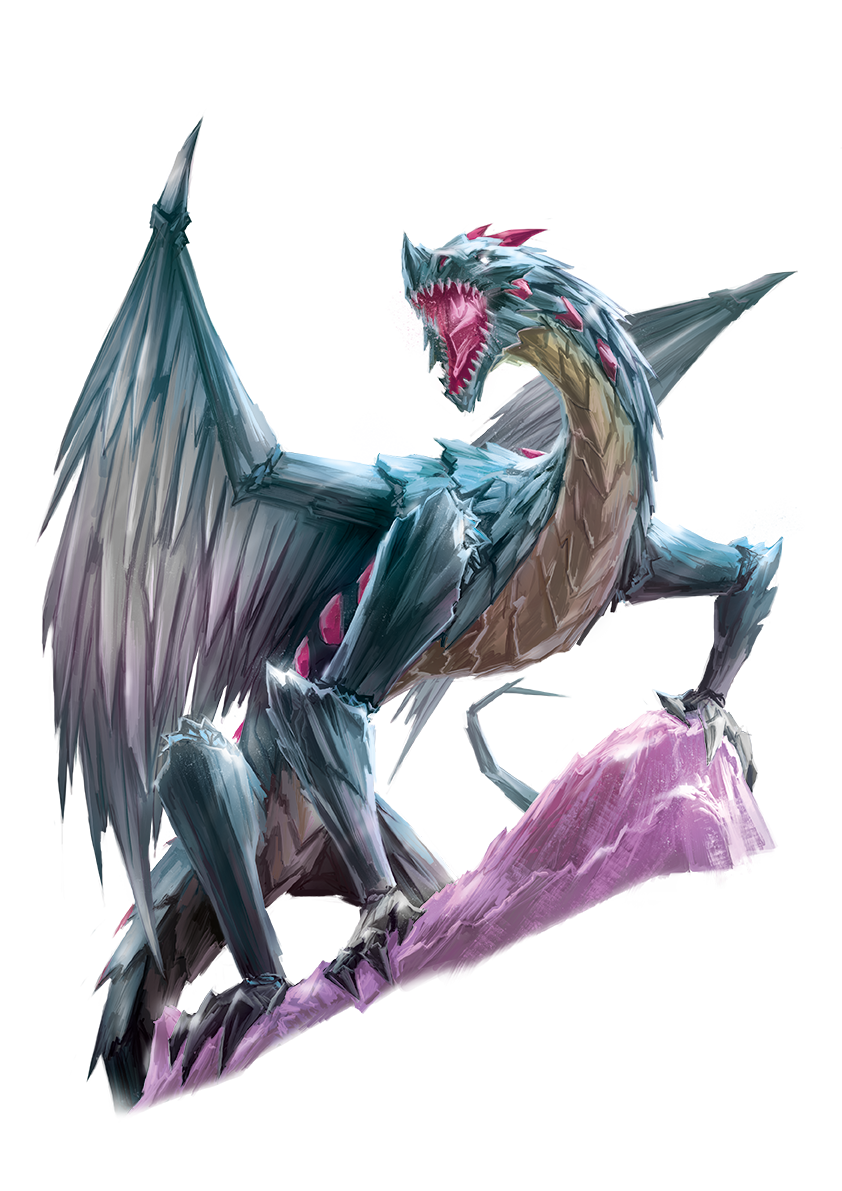 Good-natured but vain, crystal dragons are beautiful creatures with brilliant hides made of multicolored crystal and gemstone. Their beauty is a source of great pride but is also something of a weakness, as crystal dragons are easily angered by insults about their appearance. Despite their relatively benign natures when compared to other true dragons, crystal dragons can be short tempered and prone to finding insults where none were intended. Although their opinions are changeable, crystal dragons prefer orderly environments and are not fond of sudden interruptions or distractions.