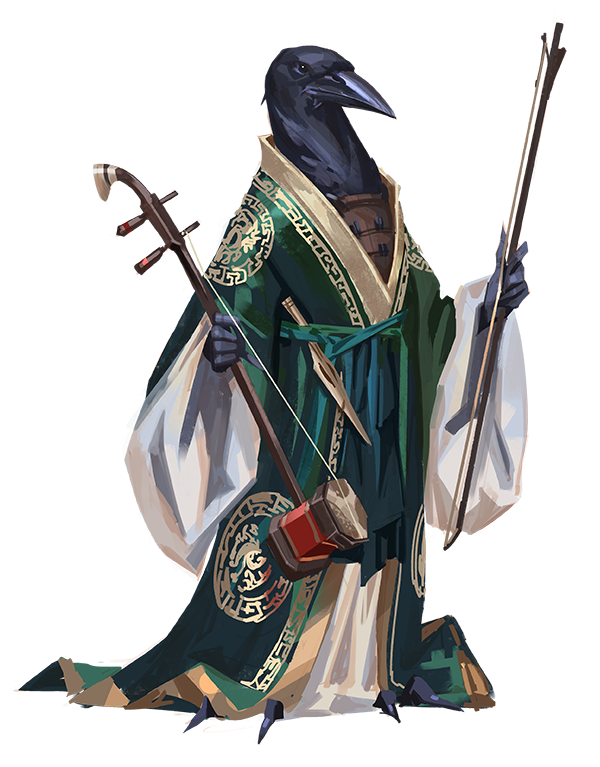 The player characters have a chance to meet Razu during the first chapter of this adventure, where he comes across as a haughty and aloof performer. Canny players likely suspect that the tengu bard is implicated in the strange extraplanar magic that causes a minor catastrophe at the Empress Yin Opera House (page 17)—and although he wasn't responsible for the accident, he is indeed working for the axiomite who is. Without hard evidence there is little to be done. Afterward, Razu moves to the background; you might choose to insert him into any of the player characters' hijinks as they traverse the city. Razu could even provide background music at the tournament itself if you so wish.
