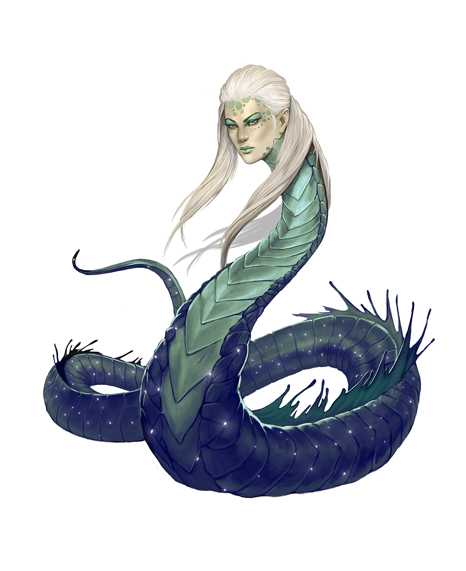 Lunar nagas are skilled diviners and astrologers whose dark scales and white hair sparkle with motes of light that mimic the night skies to which they are forever drawn. While they are less physically imposing than other nagas, they possess a graceful beauty that many find entrancing, even without the help of the naga's inherent magical abilities. Earning a lunar naga's trust is difficult, but not impossible, especially for someone who shares the creature's interest in the celestial sphere.