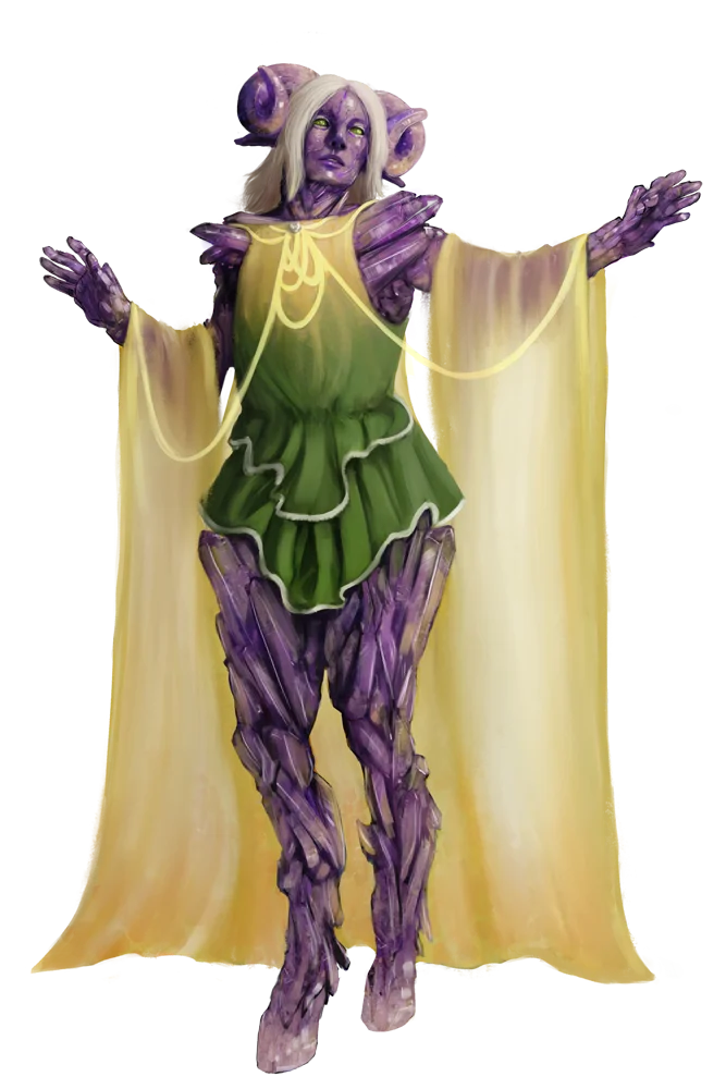 As a result of their stone affinity, aeolaekas appear less capricious than other azatas—though this is mainly due to them acting on a different geological scale—and some have willingly forged lasting accords or agreements with mortals. Aeolaekas often visit the Plane of Earth, fighting against evil earth elementals, joining jabali festivals, or simply wandering the veins and tunnels of that realm as they bask in its stony wonders. Their stone skin means aeolaekas are sometimes mistaken for statues; they use this fact to hide in plain sight when they don't want their presence known.