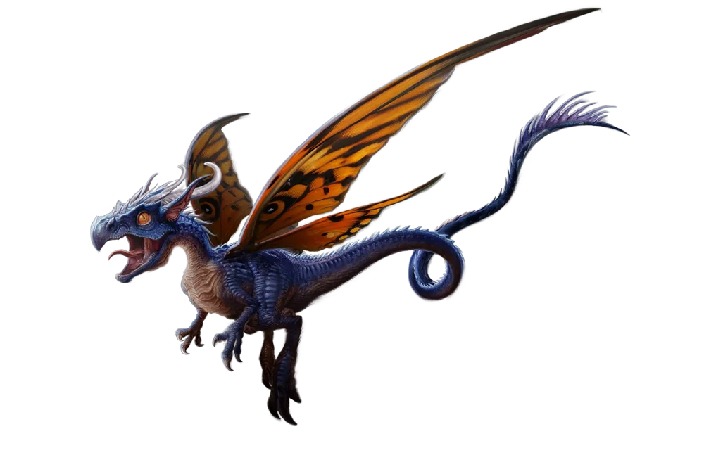 Although they are much smaller than their larger dragon cousins, fey dragonets have many of the same physiological attributes, including long necks, toothy maws, sinuous tails, and sharp claws. They flit about on iridescent butterfly wings, the coloring of which changes based on where they live, giving them a natural camouflage. Unlike their larger kin, an adult fey dragonet remains the same size throughout their lifespan. The only visual clue to the age of a fey dragonet is the sheen on their scales, a glimmer that becomes more lustrous the older they get.