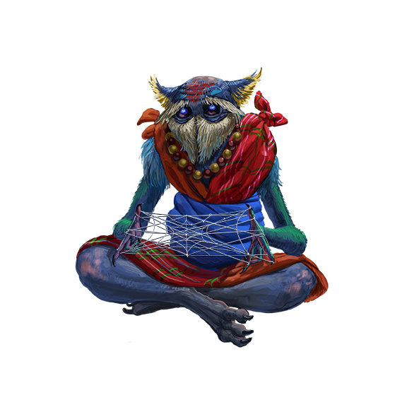 Many anadi villages believe deeply in the teachings of Grandmother Spider, the goddess of twilight, weaving, illusion, and family. The most devout anadi believe that this goddess, sometimes called Nana Anadi, long ago led their ancestors from servitude. The legend goes that when the anadi were frightened by the darkness, Grandmother Spider plucked the dewdrops from her web to hang in the sky and light the night for them. Nana Anadi is an honorary matriarch to many in Nurvatcha, though the goddess has never taken the nation's throne—and most believe she would never wish to do so, anyway.