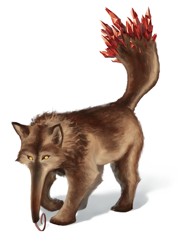 Rezzelkis are curious-looking beasts native to the deserts of Osirion. Three feet tall at the shoulder and five feet long, rezzelkis are squat, mammalian quadrupeds with tawny red fur, with crystal-studded flat tails, and prehensile anteater-like snouts. Their long, pink tongues are covered with hundreds of tiny, razor-sharp bristles that allow them to rasp through flesh with unnerving ease, even before accounting for the effect of their acidic saliva.