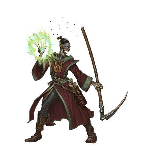 Melee [one-action] scythe +10 [+5/+0] (deadly d10, trip), Damage 1d10+4 slashingDivine Prepared Spells DC 19, attack +11; 2nd animate dead, harm (×3); 1st bane, fear, ray of enfeeblement; Cantrips (2nd) chill touch, detect magic, divine lance, forbidding ward, shield
