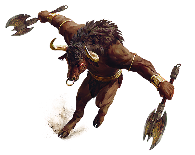 Minotaurs are master hunters that dwell in cunning labyrinths or tangles of underground caverns meant to disorient and demoralize prey. These monstrous tormentors delight in the hunt, in the terror caused by closing in on prey, and in the very moment when the hunted realizes that they have lost the game. Only then will the minotaur charge in for the kill, cutting foes down with powerful strikes or impaling them on its sharp horns.