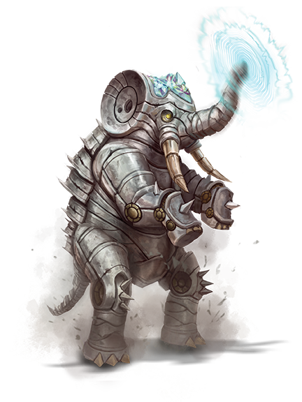 Most aolazes are built in the shape of great land-bound beasts, such as elephants, rhinoceroses, or dinosaurs. Regardless of the specific creature an aolaz has been constructed to resemble, it is not bound to walk the earth like its inspirations are—it's imbued with the magical ability to pursue across water and even through the air. Few can escape an aolaz's wrath once it is earned.