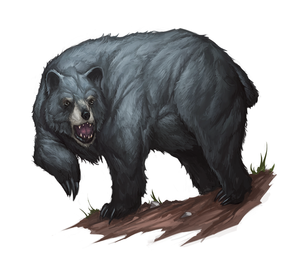 Contrary to the name, black bears can be cinnamon or even blond in coloration, depending on which hue is most beneficial for surviving in their local environment. Regardless of their coloration, they are opportunistic eaters who gain sustenance from berries and nuts just as often as from fish and smaller mammals. They steal food when they find it, including from humanoid camps. Although they are predators, black bears are more timid than other bears. Unless defending themselves or their young, black bears often avoid conflict or fight only until they can retreat.