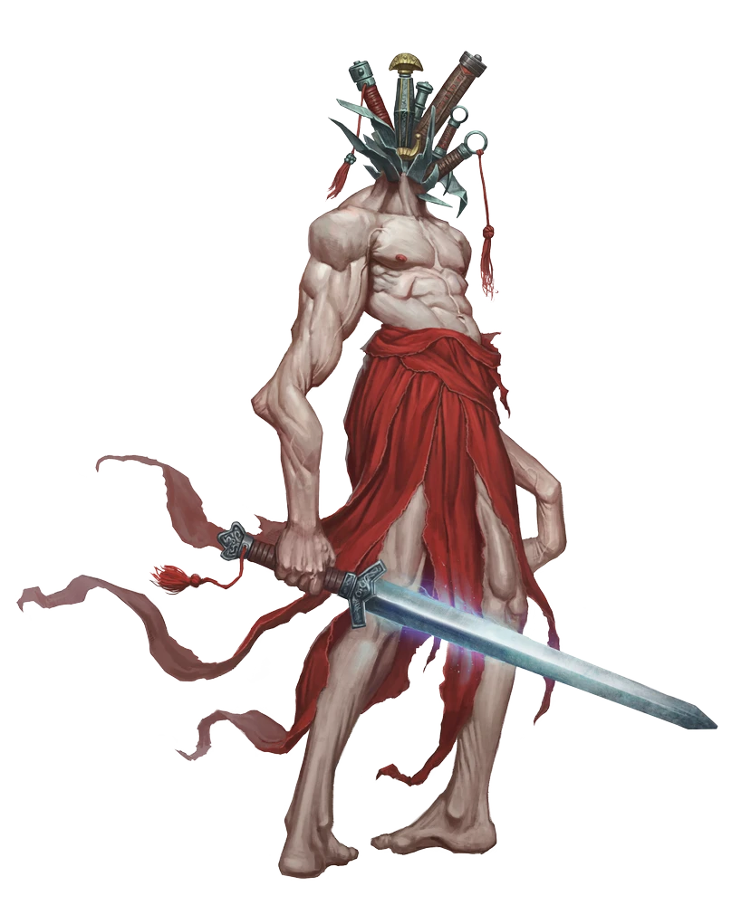 When an evil mortal soul that has been reincarnated multiple times is wrenched from the cycle of souls and corrupted, it can undergo a horrific transformation into a fiend known as a nindoru. A force for entropy and the breaking of cycles, nindorus are hideous creatures whose bodies often appear distorted, who wield weapons that have been shattered yet still function, and whose true face is often hidden from view. They display traits one might expect to see in an undead creature, such as decaying flesh or exposed bones, yet a nindoru is very much still alive.