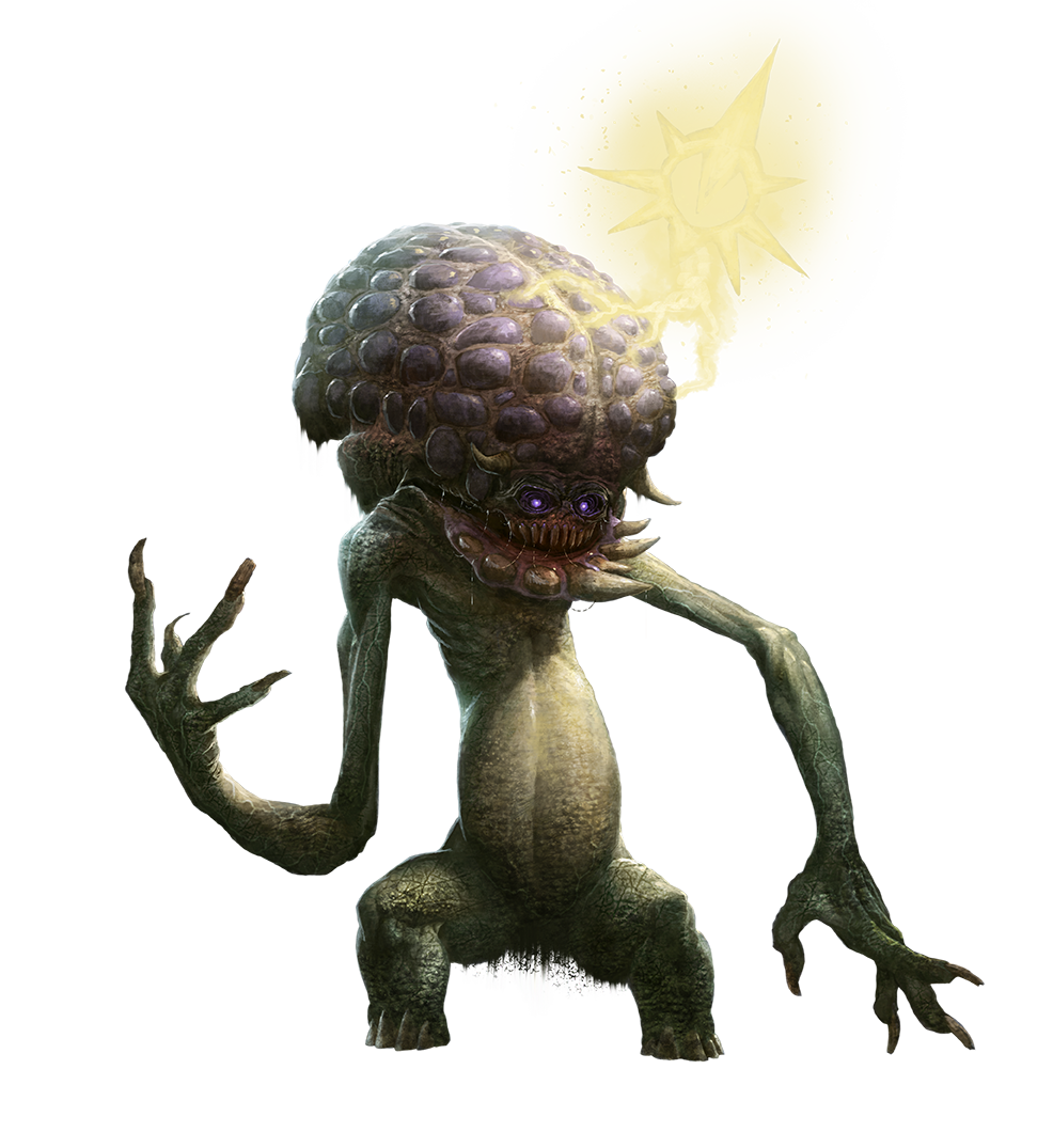 In their natural forms, gosregs dart about in a jerky gallop due to their stumpy legs and gangly arms. They take on the appearances of humanoids to infiltrate societies, and they drop their disguises only when they feel they are ultimately compromised and must resort to physical violence to protect their agendas. Their brain-like heads and bestial legs suggest a potential link with a similar Dominion of the Black agent: the dreaded intellect devourer.