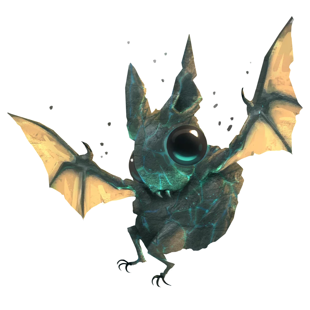 An earth scamp's rocky exterior could camouflage it well among loose rocks if not for the scamp's large eyes and bat-like wings. Earth scamps can fly, but the act of flight is uncomfortable and unnerving to them—they rarely leave the ground if they can help it. In fact, most earth scamps would rather never visit the surface at all, staying nestled deeply within the rocks they resemble.