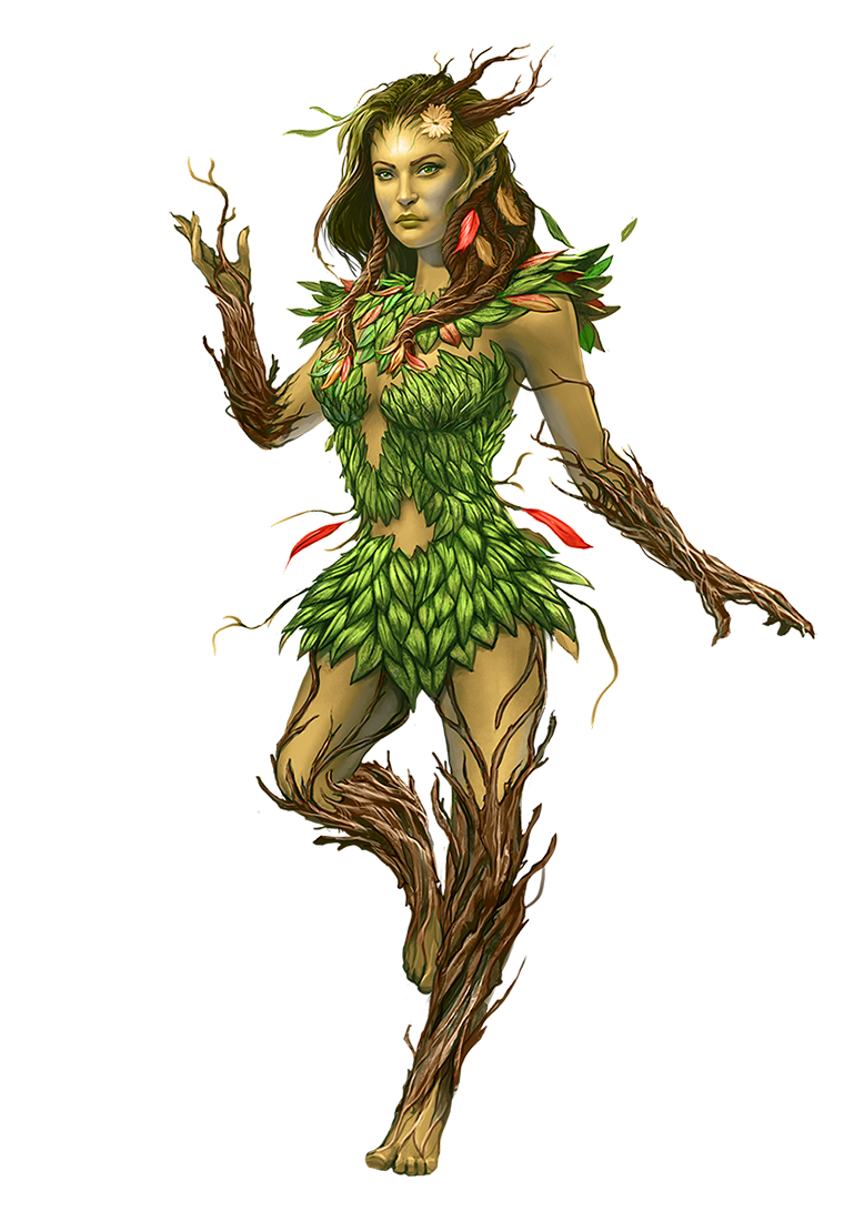 Dryads are fey guardians of the trees and creatures who dwell in wooded areas. They prefer using indirect methods to dissuade those who would harm their sacred groves and beloved forests, but they are not above using enchantments to enlist the aid of allies when evil threats cannot be dissuaded with words alone. In times of peace, dryads happily live secluded lives inside their trees, and a community at harmony with nature might not even realize a dryad lives nearby.