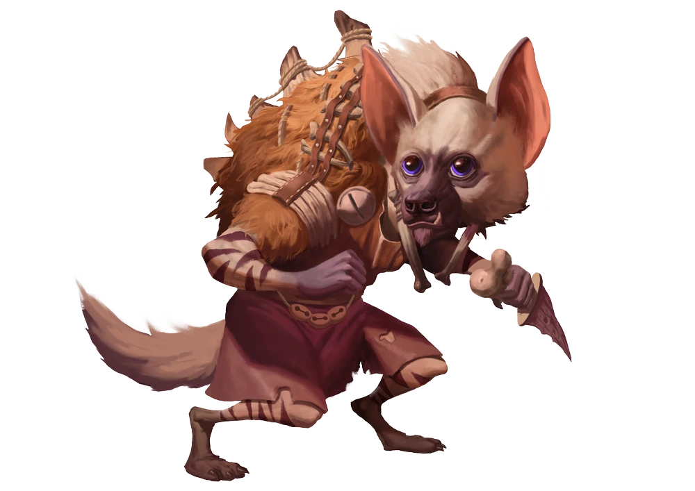Kholo are tall, hyena-headed humanoids who dwell in savannas, warm grasslands, and arid hills. Given their appearance, their affinity for hyenas should not be surprising; kholos share their homes, food, and even many of their behaviors with these animals. Much like hyenas, kholos have a notorious reputation, for much the same reason—their uncanny laughter, frightening intelligence, and efficient pack tactics make them intimidating competition or foes. Kholos are keen to lean into these rumors, using them as a form of psychological warfare against their enemies.