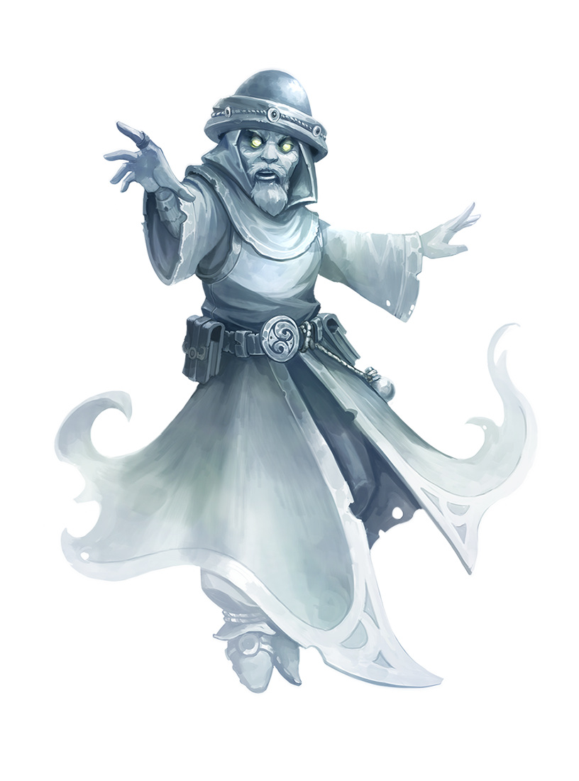 Note that the ghost mage is built from the ground up, rather than by applying the ghost rules to a once-living creature, so its numbers don’t exactly match the values listed above. This is usually the better way to go if you have the time, as it allows you to hand-craft a ghost for the situation.
