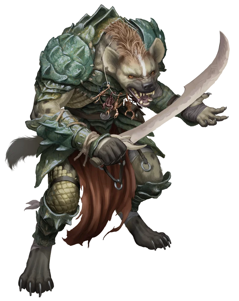 Kholo are tall, hyena-headed humanoids who dwell in savannas, warm grasslands, and arid hills. Given their appearance, their affinity for hyenas should not be surprising; kholos share their homes, food, and even many of their behaviors with these animals. Much like hyenas, kholos have a notorious reputation, for much the same reason—their uncanny laughter, frightening intelligence, and efficient pack tactics make them intimidating competition or foes. Kholos are keen to lean into these rumors, using them as a form of psychological warfare against their enemies.
