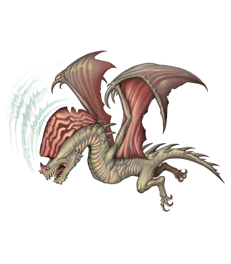 Often mistaken for drakes, soniphaks glide above rocky or barren ground, picking out prey with their hearing. A hunting soniphak disables its targets with concentrated bursts of sound before snatching them up and feasting on the move. Despite being able to speak, soniphaks are no more social than other dischorans, generally responding to even the quietest attempts at communication with destructive shouting.