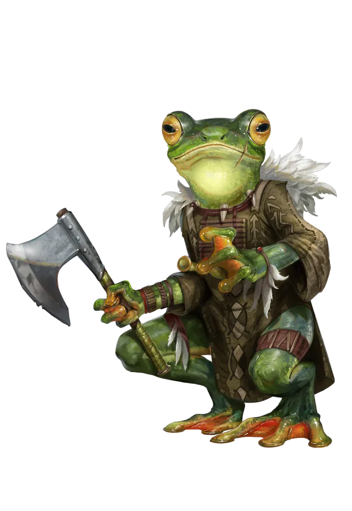 Tripkees are froglike humanoids whose spirit often exceeds their stature.Tripkees are a shy and cautious people who generally seek to avoid being drawn into the affairs of others. Despite their cautious outlook and small stature, adventurous tripkees still take bold and noble action when the situation demands it.