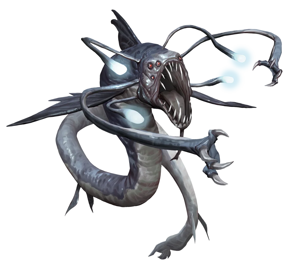 While the veiled masters are the rulers of alghollthu society, they are not the most powerful of their kind. Greater, more mysterious creatures that function as organic thought networks, immense aquatic engines of war, or specialized extractors of forgotten secrets dwell among their sunken cities. Meanwhile, the world above remains infested with creatures that were originally created by the alghollthus but have long since drifted away from their aquatic progenitors to become their own sinister monstrosities.
