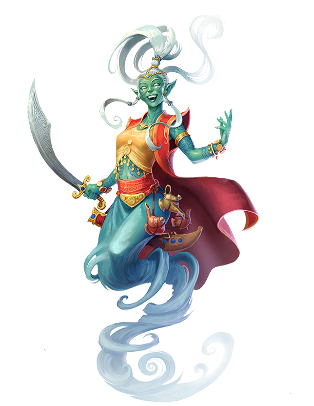 Genie nobles with titles unique to their kind (as detailed in each sidebar) rule genie society. Genie nobles are generally at least 5 levels higher than a typical example of their kind. In addition to the increased statistics afforded by their higher levels, genie nobles gain additional spells. But the most wondrous (and notorious) of a genie noble’s powers is their ability to grant wishes. Any genie noble (save for jann, who lack this power) can grant a mortal or undead creature up to three wishes within a year’s time. Many unscrupulous creatures compel genie nobles to serve them, tricking them or entrapping them with magic. However, once a genie noble grants a third wish to a single creature, they are freed from service to that creature forever.