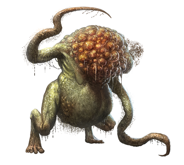 The isqulug's appearance, though unsettling, might be its least awful aspect. The creature resembles a bipedal amphibian with tentacles instead of arms and a head composed of an undulant mass of what appear to be shifting, slimy transparent eggs filled with writhing larvae. In truth, these larvae constitute the mind and consciousness of the isqulug—its “body” is little more than an organic suit manufactured from the flesh of those it has consumed, analogous to the complex web of a spider or the hive of a colony of bees, but fully capable of movement and violence.