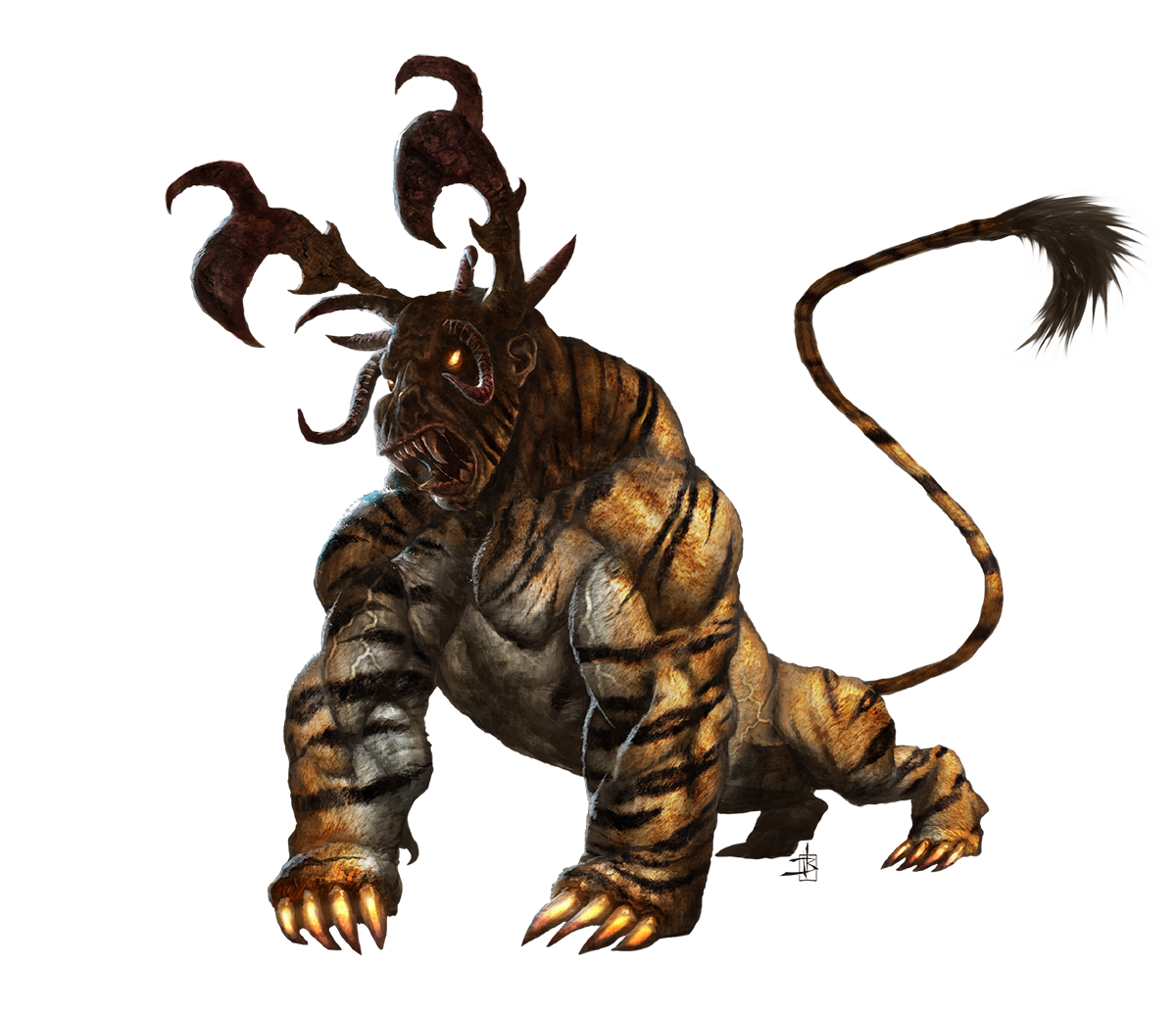 Leydroths look like distorted, apelike felines with many-branching horns growing from the backs of their heads. Their thickly muscled limbs end in glowing claws.