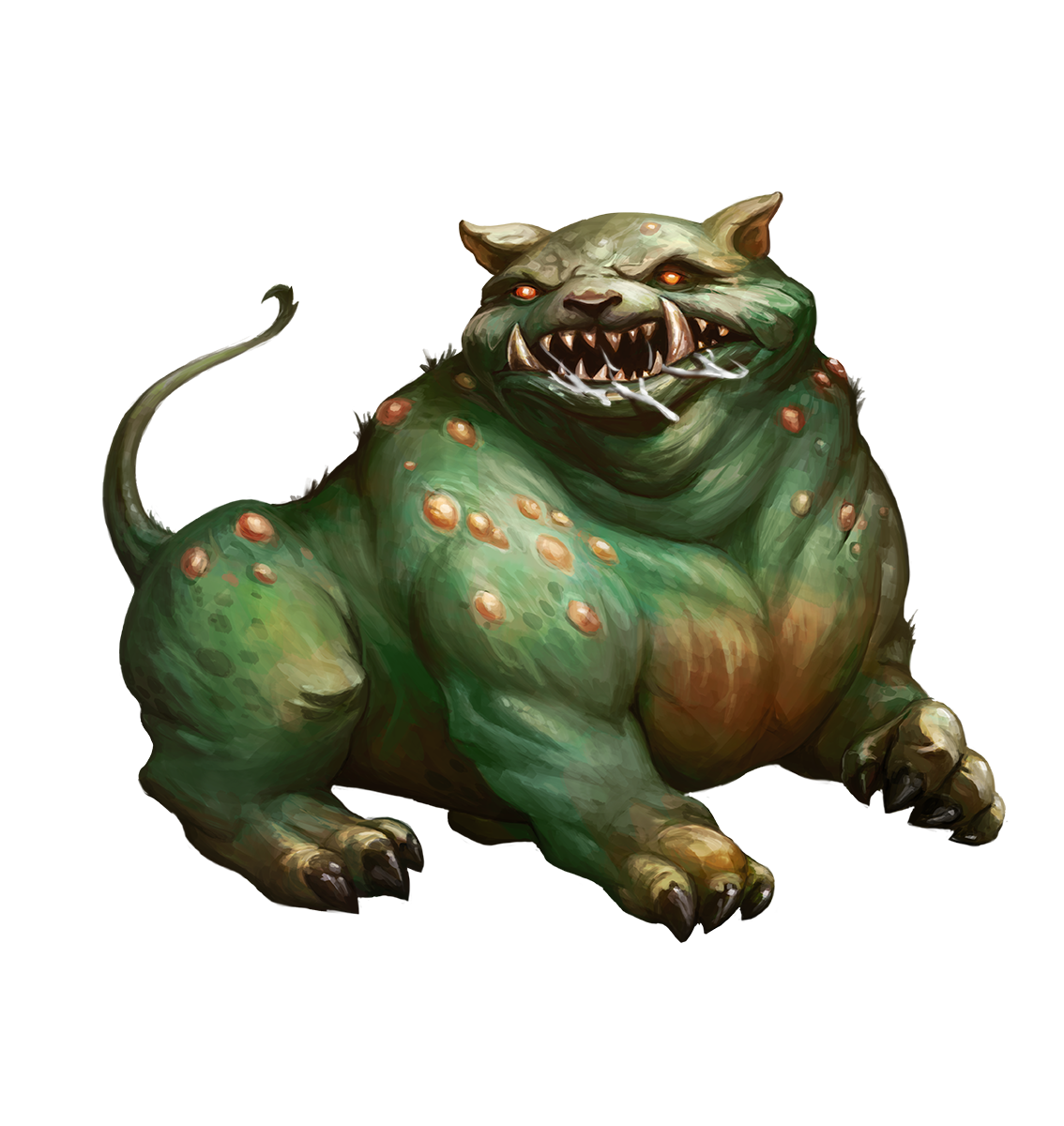 Covered in fetid, weeping sores, trollhounds are carriers of a debilitating contagion known as bloodfire fever. Creatures that contract the disease through the bite of a trollhound experience deep internal pain, as if their blood were on fire. Additional symptoms include loss of muscle coordination, pus-filled blisters, and overall lethargy and fatigue. Other than suffering from skin irritation, both trolls and trollhounds are immune to the major effects of the disease.