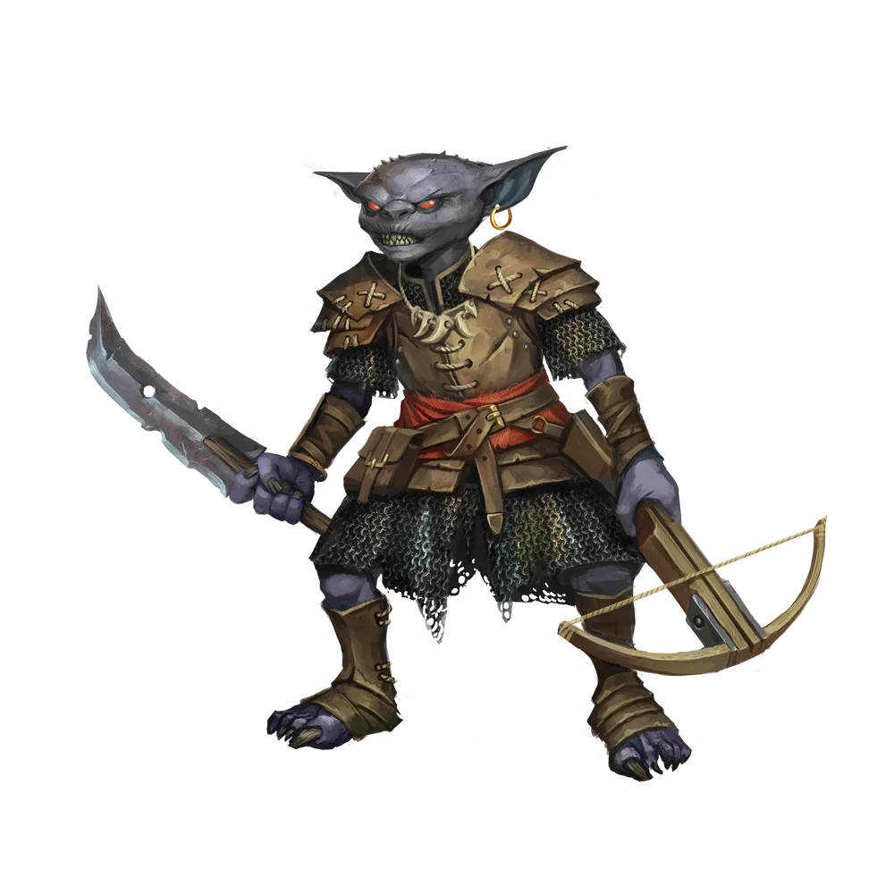 Hobgoblins may appear to outsiders to be the most civilized of goblinkind, but their civilization is hardly one of kindness and equality—instead, they revel in all that is militaristic, tyrannical, cruel, and destructive. Hobgoblins are singularly devoted to war, and their entire culture is built upon fostering and maintaining conflict while simultaneously proving their superiority in battle. Hobgoblins are highly organized, and they work efficiently and effectively in groups, whether that group is a small raiding party, a roving war band, or a fully regimented army. Hobgoblin rulers require little provocation before declaring war, and more often than not, such wars are waged to gain resources or territory. Physically, hobgoblins stand about as tall as humans and have gray skin.
