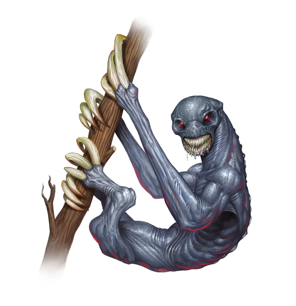 The sleek, dark niliths resemble hairless, emaciated tree sloths. These creatures are intensely dangerous and fearsome, with glowing red eyes, wicked claws, and mouths full of needlelike teeth. Niliths feed off the emotions, fears, and flesh of the living, and folktales posit that those who have nightmares of these creatures are fated to one day be eaten by them. Niliths draw intense joy from tormenting sapient creatures, often focusing their predations on the pious and the just, from whom they draw forth their most basic fears and worst thoughts and revel in their victims' subsequent terror. More often than not, these despicable manipulators wish to drive their victims into madness and even to suicide. Most niliths lack the patience to spend too much time fully tearing down an individual, and when a nilith tires of its current plaything and becomes bored with its particular thoughts and fears, it murders the quarry before feeding on its flesh and moving onto the next victim.