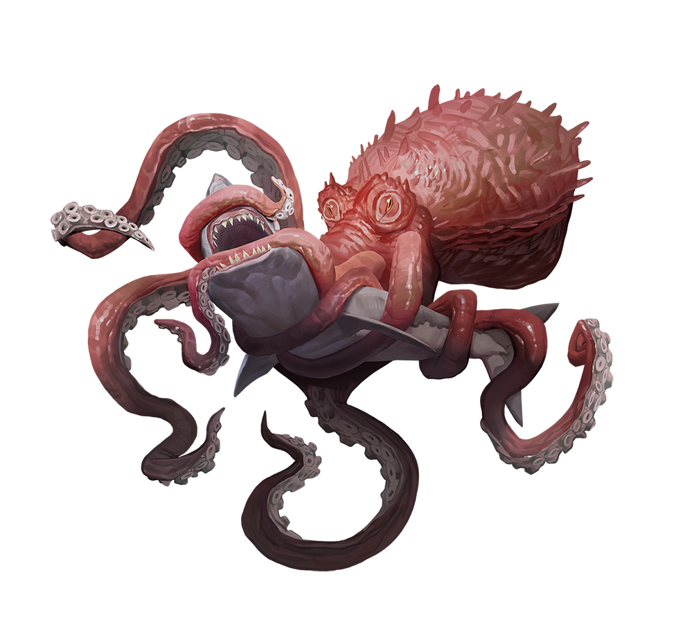 The octopuses presented here are smaller versions of the much larger giant octopus, but other species exist as well. The brightly colored seafire octopus occupies a predatory niche somewhere between the reef octopus and giant octopus—its bite injects a venom that causes a painful rash and nausea. The immense grisly octopus is among the largest of its kind. It can swallow humans whole and can squirt particularly sticky crimson ink to incapacitate prey.