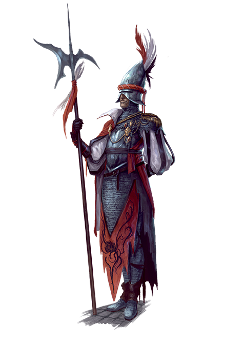 Every palace has its gatekeepers. Often the younger offspring of minor nobility or those from long lines of trusted staff, the palace guards are in charge of defending the royal family and their inner stronghold. Their days consist of guarding doorways, escorting nobles to various locations, and keeping those in their charge as safe as possible. The statistics below are for the lowest rank-and-file member of a small nation's palace guards; they also work well for elite guards of a lesser noble.