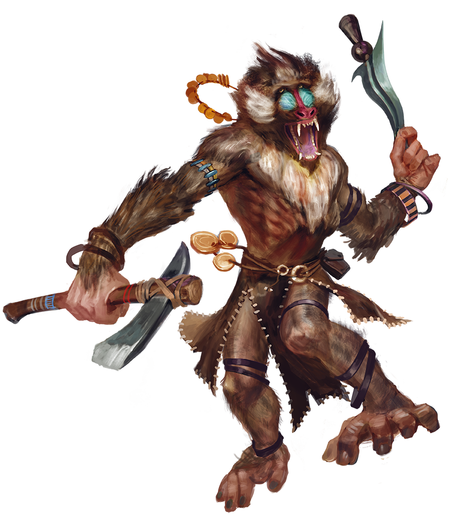 Charau-ka are small humanoid apes who live in tropical jungles, especially within the Mwangi Expanse. Shrieker crews patrol the canopies close to charau-ka settlements, keeping predators at bay. Sometimes, a group of charauka will devote themselves to the demon lord Angazhan and become a bloodthirsty hunting party.