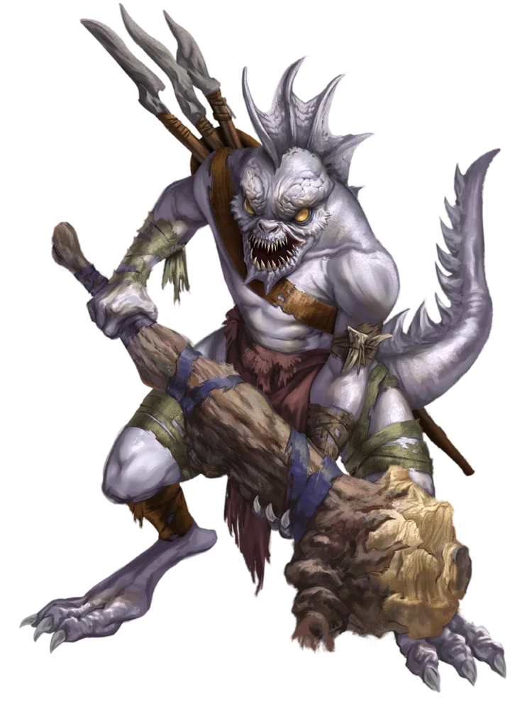 Reptilian humanoids who live in the uppermost reaches of the Darklands, xulgaths (known as troglodytes to many surface-dwelling folk) often attack intruders in their territory on sight. They live in simple familial communities called clutches, battling rival groups and other aggressive Darklands inhabitants in order to survive. They occasionally raid surface settlements, usually at the behest of cruel, bloodthirsty leaders who are often themselves in the thrall of more powerful creatures like nagas or demons. A typical xulgath has dull gray, dark gray, or ashen scales, with a long tail and bony protrusions that run the length of their spine. A typical xulgath is 5 feet tall and weighs 150 pounds.