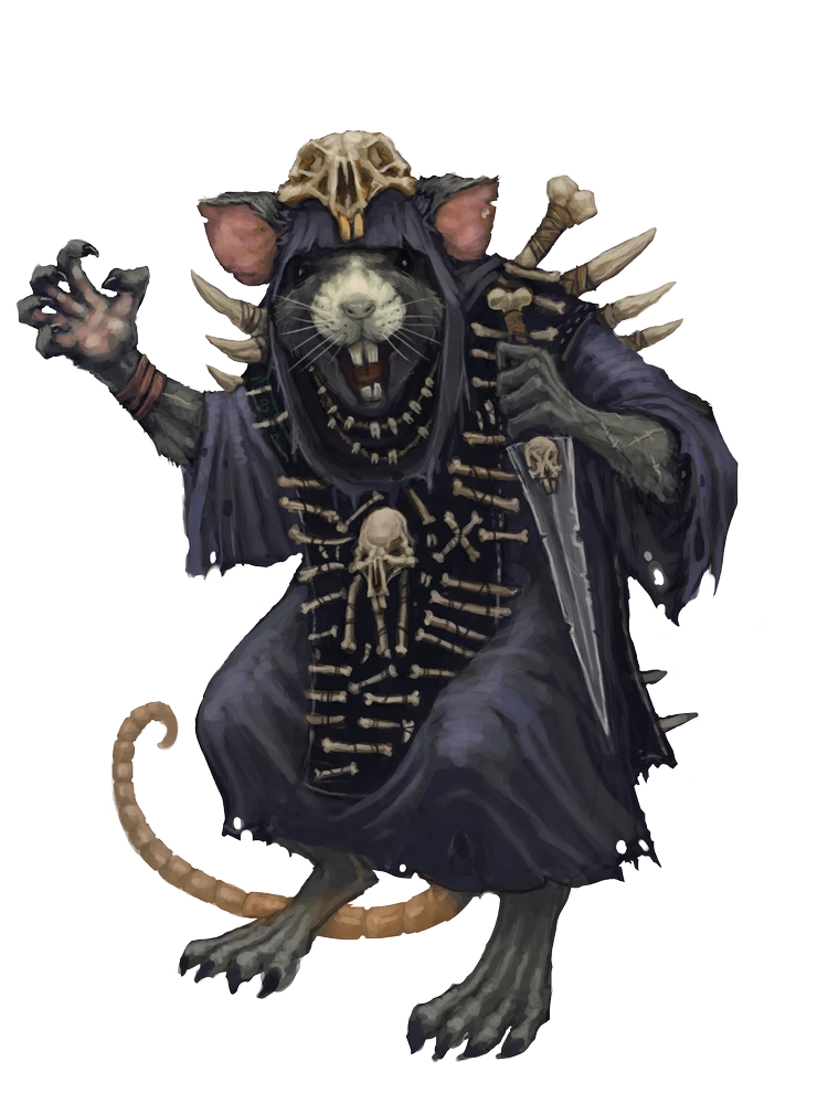 The bone mother—a warren's oracle—cuts an imposing figure. Bone mothers can be any gender despite the name, wearing the skull of a giant rat and covering their clothing in dangling bones. When a member of the warren dies, they gift a bone (usually a finger bone) to the oracle, who exists as both a physical repository of those who came before and a living history of their warren.