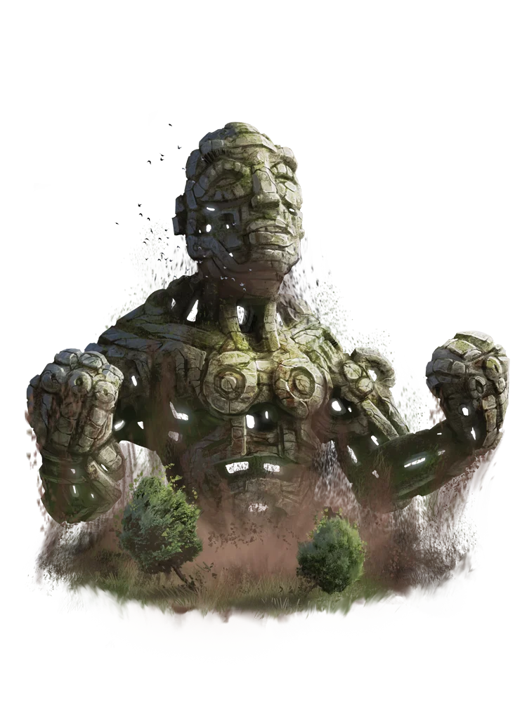 A guthallath is an enormous construct created long ago, probably as a war machine, by a long-forgotten empire. Nearly 100 feet tall, this massive stone statue typically resembles a stalwart warrior wearing only a loincloth and skullcap. Few have seen the entire body of a guthallath, though; most of the time, the relic is buried up to its neck, covered in moss, and stranded in a forgotten place. Yet every so often, one of these harbingers of destruction reactivates in response to some unknown stimulus or rallying call, and when this happens, woe to any who stand in its way.