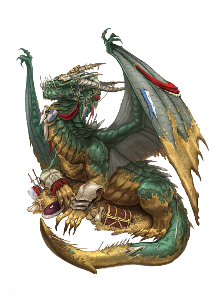Fortune dragons have the innate ability to draw upon the raw magical energies that surround them. They constantly use these magical energies to empower their magical abilities and even their bodies, as the energy can heal wounds. A fortune dragon has a typical build for an arcane dragon, but their bodies sport a striking feature: their treasure. The dragon's nature of drawing upon magic causes coins, gems, and, most notably, magical items to cling to their body like iron drawn to magnets. A dragon constantly pulls magical energies from the items attached to their body and makes use of these energies to cast spells. The magical energies that flow through a fortune dragon constantly flow through the dragon's items as well, and in many cases, the items melt from the heat produced in this process. Fortune dragons are seekers of novel experiences. This desire for originality leads fortune dragons to approach visitors of other ancestries with curiosity, though this initial interest quickly wanes if a visitor lacks exciting qualities.