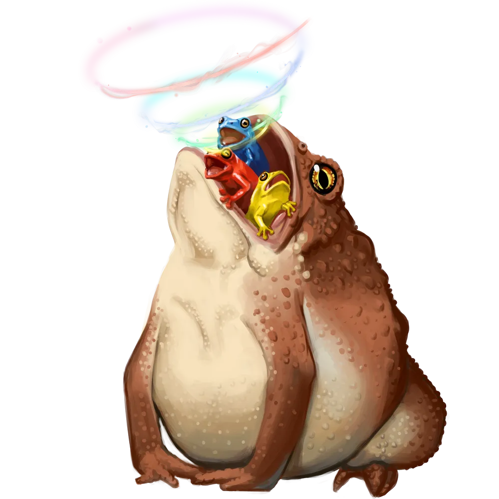 Three-Frog Orchestra The concert frog has three froglets perched behind its lips, each of a different color. A creature can specifically target a froglet. If any froglets have died, the concert frog attempts a DC 11 flat check at the end of its turn; on a success, new froglets hatch in its stomach and emerge at the concert frog's lips.