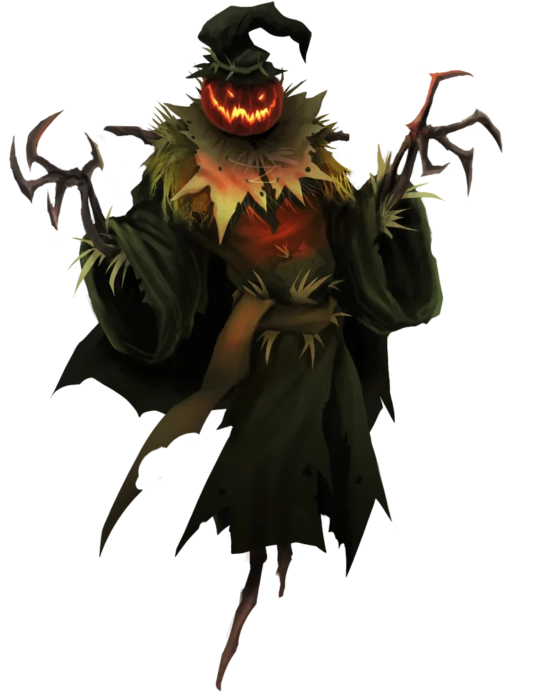 A ramshackle collection of materials in a human shape, the scarecrow construct is indistinguishable from a normal scarecrow until it slowly creaks to life. As it animates, its carved pumpkin or sackcloth face bursts into eldritch flame, sending fear creeping into the air around it. Each scarecrow is handcrafted and unique in its appearance, though most are 5 to 6 feet tall and constructed of a combination of wood, cloth, rope, straw, sawdust, discarded husks and cobs, and similar materials, all dressed in ragged pastoral garments. This rudimentary construction makes a scarecrow somewhat fragile, prone to snapping limbs in the crush of battle. Yet its structure is adaptable, allowing it to reshape another piece of itself into a clawed limb or grip a severed portion of itself to swat at its foes.