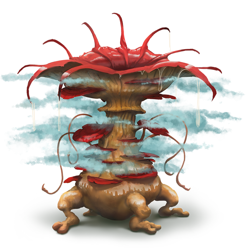 The basidirond, also called a mindfrond, is a fungal creature that crawls about on woody tendrils. The large, bowl-shaped pod atop its body collects mineral-rich moisture—-whether runoff from cave walls or fresh blood—-for sustenance. It uses hallucinogenic spores to incapacitate prey long enough for it to beat its prey to a bloody pulp, then deposits the deliciously tenderized remains into this pod for consumption. A basidirond is over 6 feet tall and 3 to 4 feet wide, and weighs nearly 300 pounds when saturated.