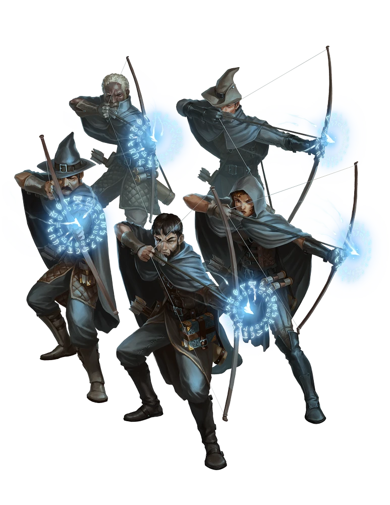 Bash Heads [two-actions] (nonlethal) The watchmages lash out against all enemies in a 5-foot emanation with their fists, dealing 4d4+4 bludgeoning damage with a DC 29 basic Reflex save.Fire Shortbows! [one-action] to [three-actions] (arcane) Frequency once per round; Effect The watchmages fire a volley against each enemy in a 10-foot burst within 150 feet, with a DC 26 basic Reflex save. The damage depends on the number of actions. When the squadron is reduced to 2 or fewer segments, this area decreases to a 5-foot burst.