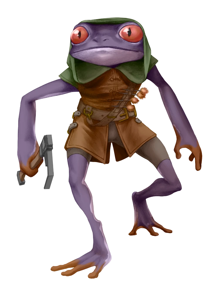 Traditionally making their homes in the treetops of tropical jungles and forests, these frog-like humanoids are often seen as resourceful and cautious, preferring to live and hunt hidden in the branches of tall trees.