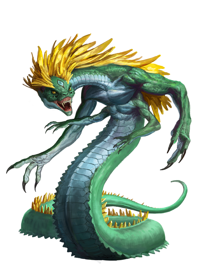 Proteans divide themselves into a loose caste system and possess a dizzying variety of powers. Most proteans have a serpentine body with the head of a primeval beast. Scholars have long been intrigued by this fact—that scions of dissolution and disorder would share so many features—pointing out that even in the purest chaos there is some semblance of order. Others note that the serpentine form is one of the most primeval shapes, perhaps suggesting that in a reality at the dawn of time, such shapes were all that could exist. The proteans themselves have little to say on the matter, which, perhaps ironically, only adds to the confusion and lack of consensus surrounding their kind. After all, if even chaos cannot be trusted to be chaotic, would that not be the purest form of entropy?