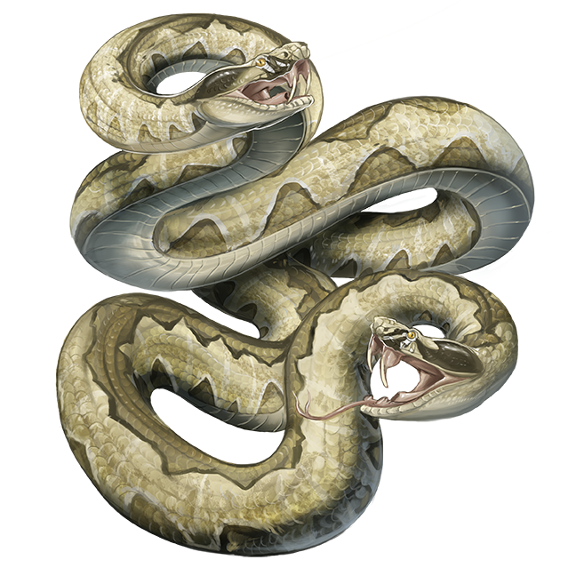 The first amphisbaena is said to have formed from the blood that fell as a medusa's head was severed. This story's origin most likely stems from the fact that amphisbaenas are oddly immune to petrification, which in turn leads to them sometimes being kept as pets by a medusa. A medusa who keeps an amphisbaena as a pet might regard the viper as their most treasured companion or perhaps even as their own child. Despite these fabled supernatural origins and the occasional special treatment they receive, however, amphisbaenas are entirely mundane animals with only rudimentary intelligence and no innate magical abilities whatsoever.
