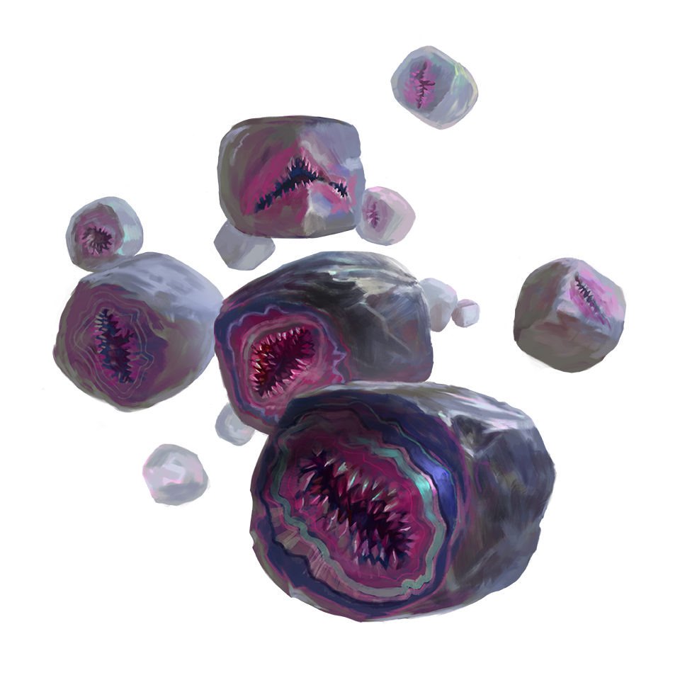 Cobble mites resemble squarish stones a few inches across with mouths like split geodes. Though indolent and harmless alone, they're dangerous in large groups.