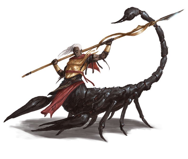 Girtablilus are desert-dwelling guardians with the upper bodies of muscular humanoids and the lower bodies of massive scorpions. They are most often found defending ancient temples and religious artifacts with zealous fervor. Some believe they were created by a long-dead god millennia ago to act as guardians, but girtablilus consider the subject of their origin taboo and refuse to address the theory.