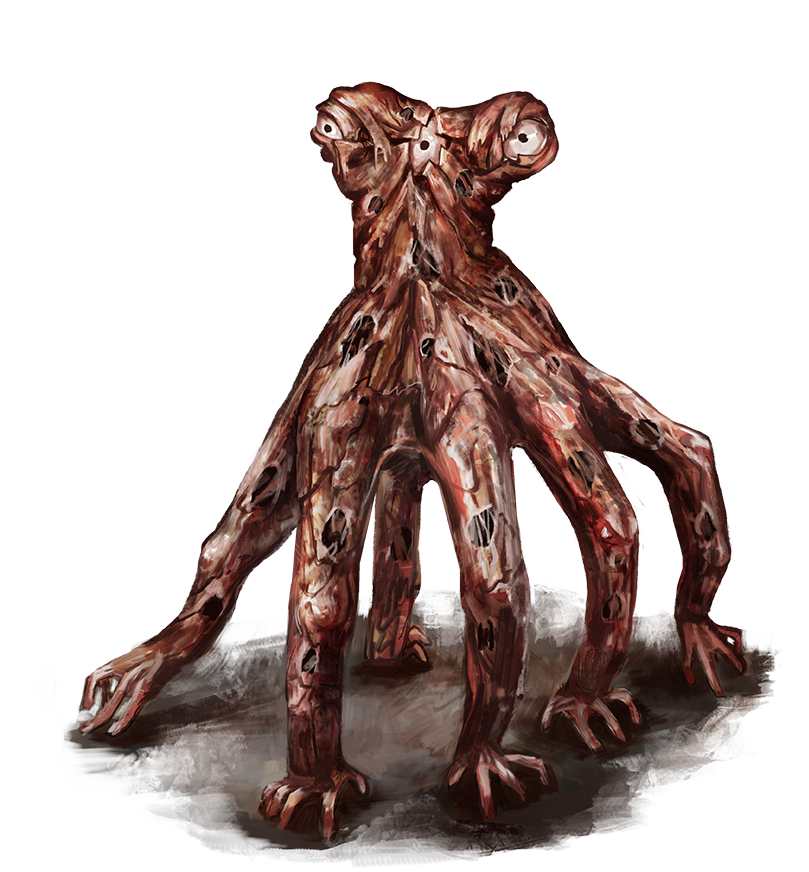 At a distance, the creature known as Kuworsys might be mistaken for a crawling undead hand, possessed of two thumbs instead of one. These “thumbs” are actually the being's hind limbs, which it can clumsily stand upon should it choose. Each of its fingerlike limbs bears a smaller hand on the end, giving Kuworsys an eerie gait possessed of too many moving joints. Wedged within the wrist-shaped tissue that makes up the creature's head are three bloodshot eyes, glaring balefully from lids twisted into shape from ropes of flesh.