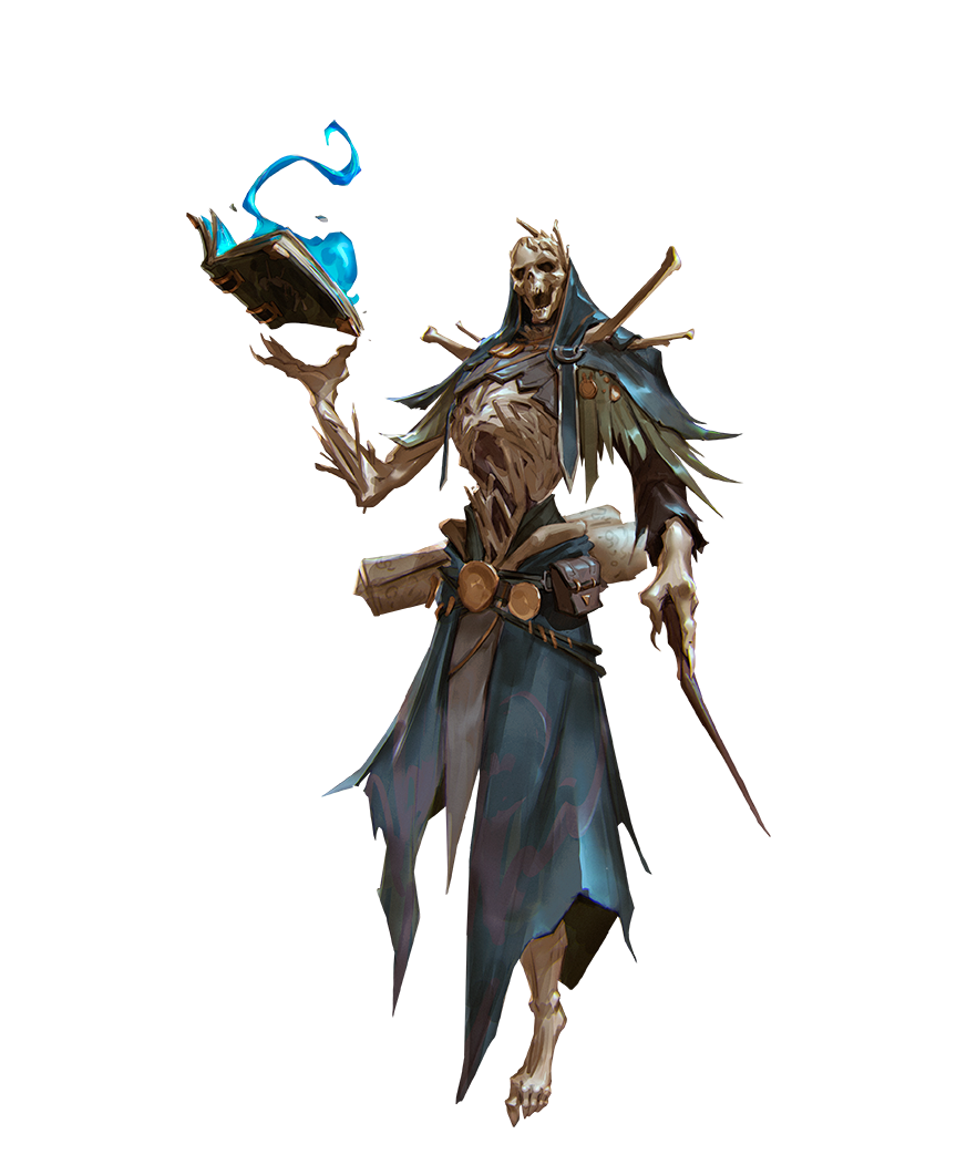 At first glance, a horde lich looks like a skeleton packed with too many bones. In combat, the true purpose of these extra parts becomes clear as limbs peel off, expanding and reassembling into another nimble skeletal form. Regardless of the number, the single lich mind controls them all, and if any of them survive an encounter, they can rebuild the whole given enough time and raw materials.