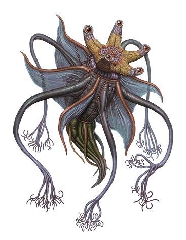 A typical elder thing is 6 feet tall from head to foot, with a 7-foot wingspan. Their bodies are radial in nature, with five wings, five tentacle-like arms that each end in a writhing nest of tendrils, and five eyestalks. At one end of their barrel-shaped bodies are several larger tentacles they use for combat and locomotion, while at the other, at the center of their five eyes in their starfish-shaped heads, sits a single mouth surrounded by multicolored cilia. An elder thing's language is a mix of piping and whistling sounds, but they can vocalize a wide range of other languages as well—albeit with a strange, high-pitched accent.