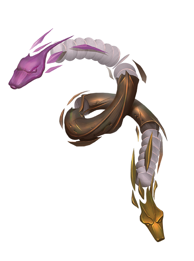 A skymetal striker resembles a serpent—or, more precisely, the two-headed serpent known as an amphisbaena—made of a long string of dozens of spinning, sharp-toothed circular saw blades. These blades array themselves along the creature's body like beads on an invisible cord of magnetic force. Although the blades making up the creature are typically composed of many different metals and alloys, it is best known, feared, and named for the blades of orichalcum and inubrix that form the “heads” at either end of its serpentine body.