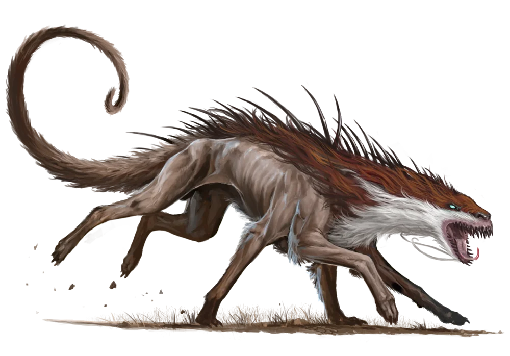 Bandersnatches are great six-legged cats with wicked quills running down the length of their bodies down to the tips of their mighty tails. As with other legendary creatures from the First World, such as the jabberwock, bandersnatches belong to the infamous group of creatures known collectively as the “Tane.” These terrifying hunters take great delight in taking down other deadly or intelligent predators by perfectly adapting to any environment they find themselves in. A bandersnatch stalks their quarry before lashing out with speed and ferocity. Those who survive a bandersnatch attack will confirm that while the cats' fangs and claws are deadly, their eyes are their greatest weapon of all. A bandersnatch's eyes are constantly shifting in color, intensity, and design, causing those they gaze upon to fall into a confused panic.