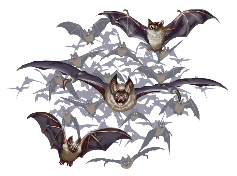 A wide range of bats dwell throughout the world. Most of these nocturnal animals are harmless insectivores, but deadly breeds of vampire bats and oversized bats the size of horses pose much more significant threats to adventurers.