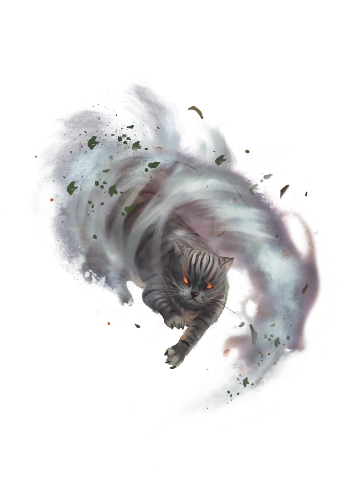 Cinder Dispersal [reaction] (fire, primal) Frequency once per day; Trigger The elananx takes damage from a hostile source; Effect The elananx disperses into a cloud of smoke and cinders, filling its space and a 20-foot emanation. While in this form, the elananx can't be attacked or targeted, and it doesn't take up space. Anything inside this cloud is concealed, and any creature ending its turn there takes 2d6 fire damage. At the start of its turn, the elananx returns to its normal form in any square the cloud covered. If the elananx Strikes a creature using its first action after returning to its normal form, the target is off-guard and the Strike deals an extra 1d6 fire damage.